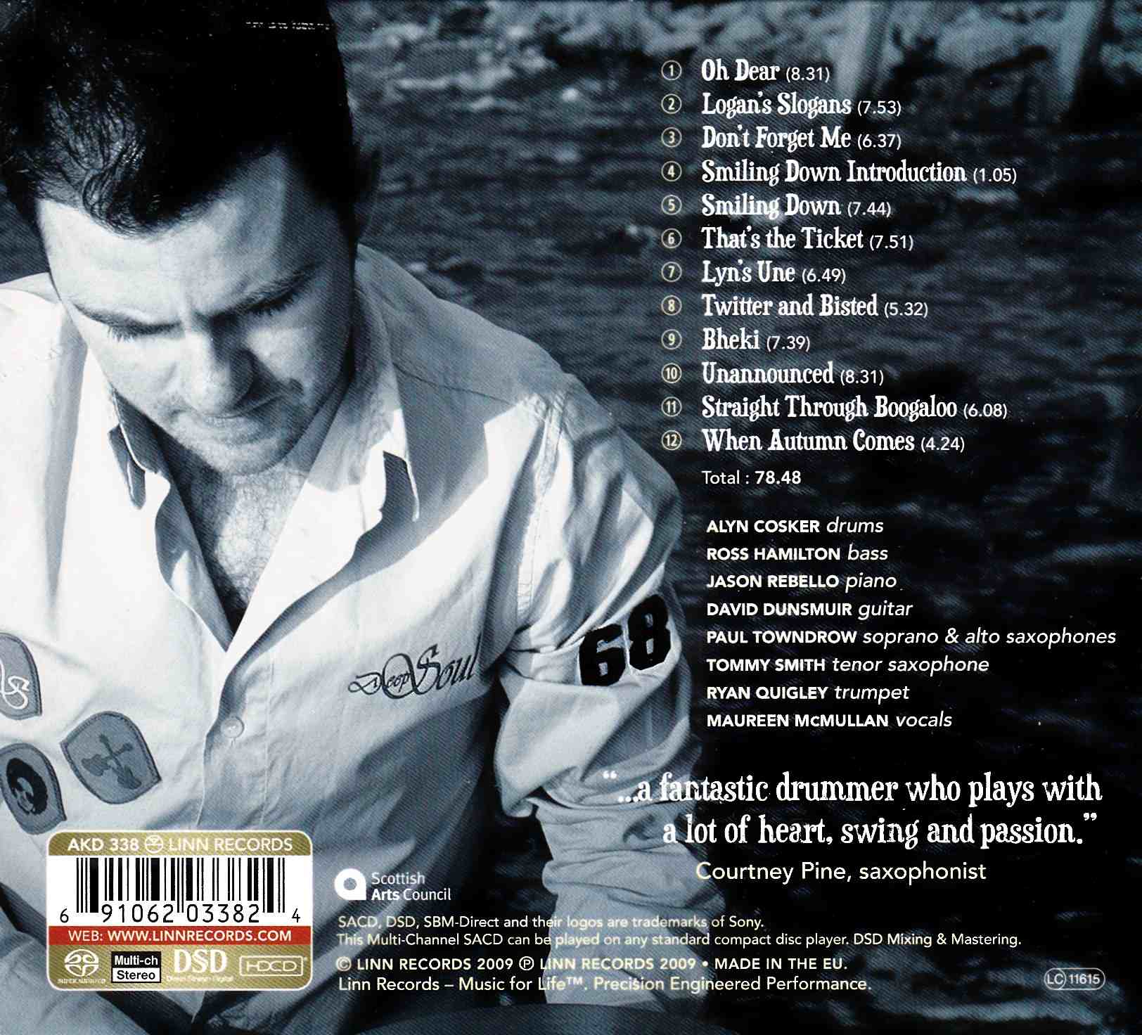 ‘Lyn’s Une’ is an album of searching electrifying jazz with compositional flair and mighty muscle from drummer extraordinaire Alyn Cosker. ‘Lyn’s Une’ (a typing error for ‘Alyn’s Tune’) showcases Alyn as an impeccable drummer equally comfortable at writing new tunes for a variety of instruments and vocals. His growing reputation has attracted top-class musicians who show the strength of the current Scottish jazz scene.