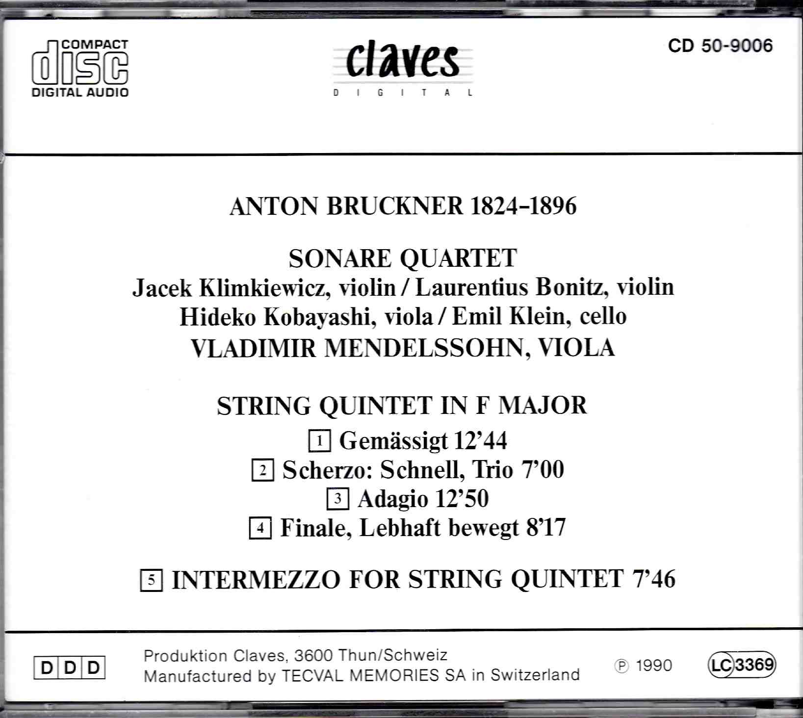 Bruckner: String Quintet in F Major; Intermezzo in D Minor – Sonare Qt, Mendelssohn | CD, Claves