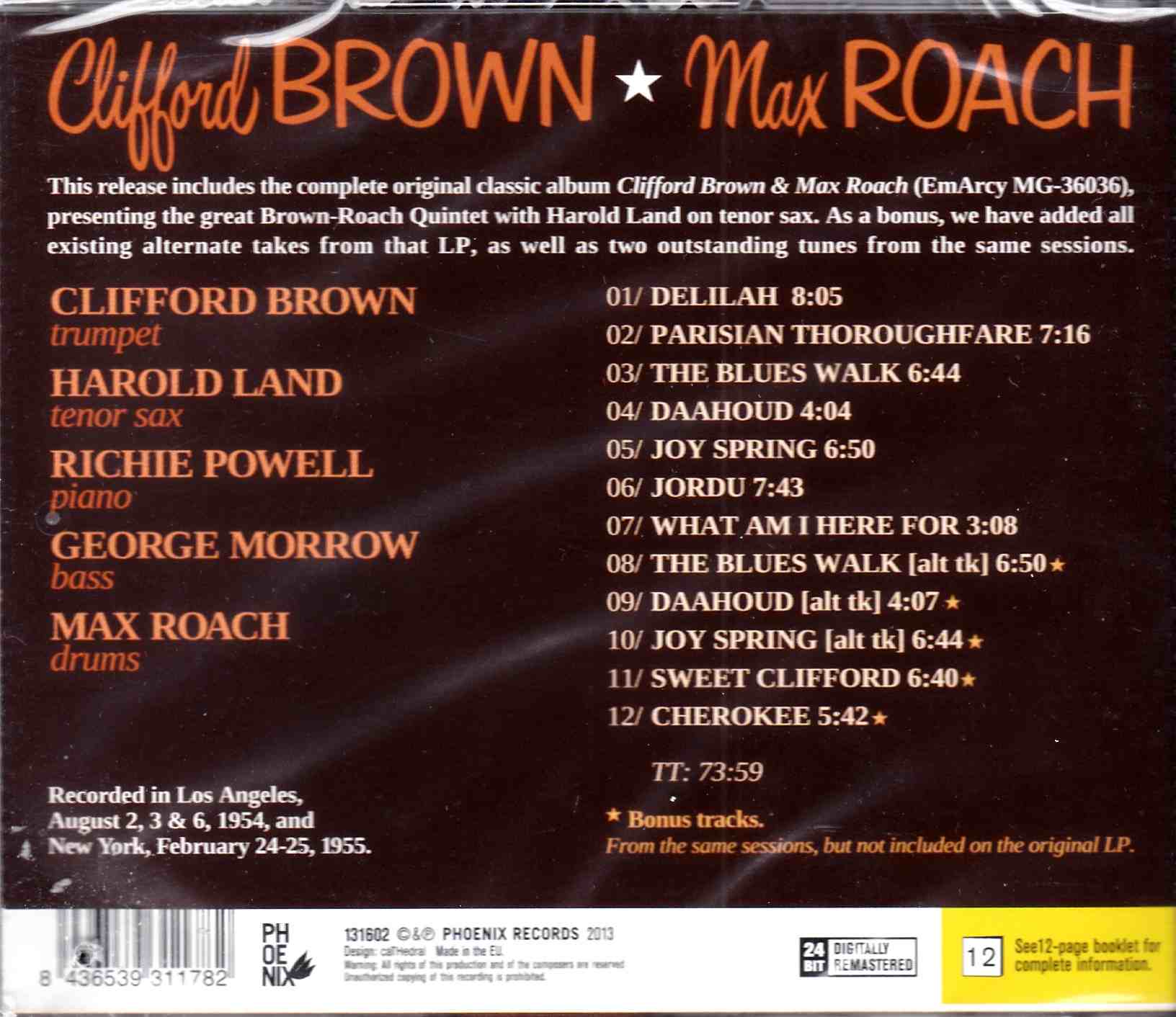 The complete original classic EmArcy album with Clifford Brown (trumpet), Harold Land (tenor sax), Ritchie Powell (piano), George Morrow (bass) & Max Roach (drums). In its short period of existence (ending when Clifford Brown and Ritchie Powell died in a car accident in 1956) the Roach-Brown quintet produced some genuine jazz milestones and was renowned not only the amazing trumpet playing but also for the interaction and understanding between the members of the band. Includes five bonus tracks from the same sessions and 12 page booklet.