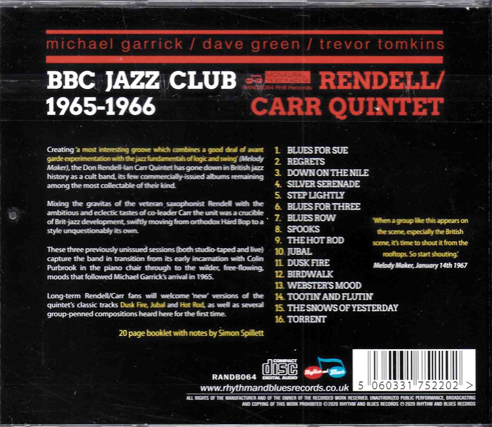 These three previously unissued sessions (both studio-taped and live) capture the band in transition from its early incarnation with Colin Purbrook in the piano chair through to the wilder, free-flowing, moods that followed Michael Garrick’s arrival in 1965. Long-term Rendell/Carr fans will welcome ‘new’ versions of the quintet’s classic tracks Dusk Fire, Jubal and Hot Rod, as well as several group-penned compositions heard here for the first time.