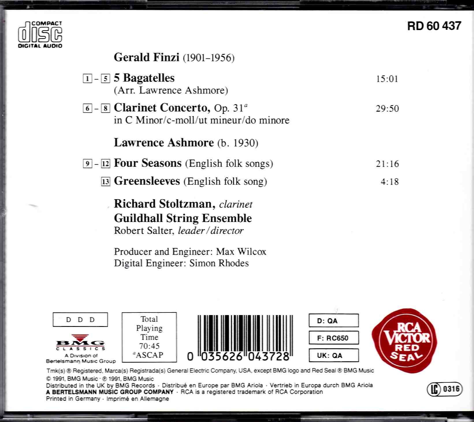 Finzi: Clarinet Concerto, Op.31; 5 Bagatelles – Richard Stolzman, Guildhall String Ens. | CD, RCA Red Seal