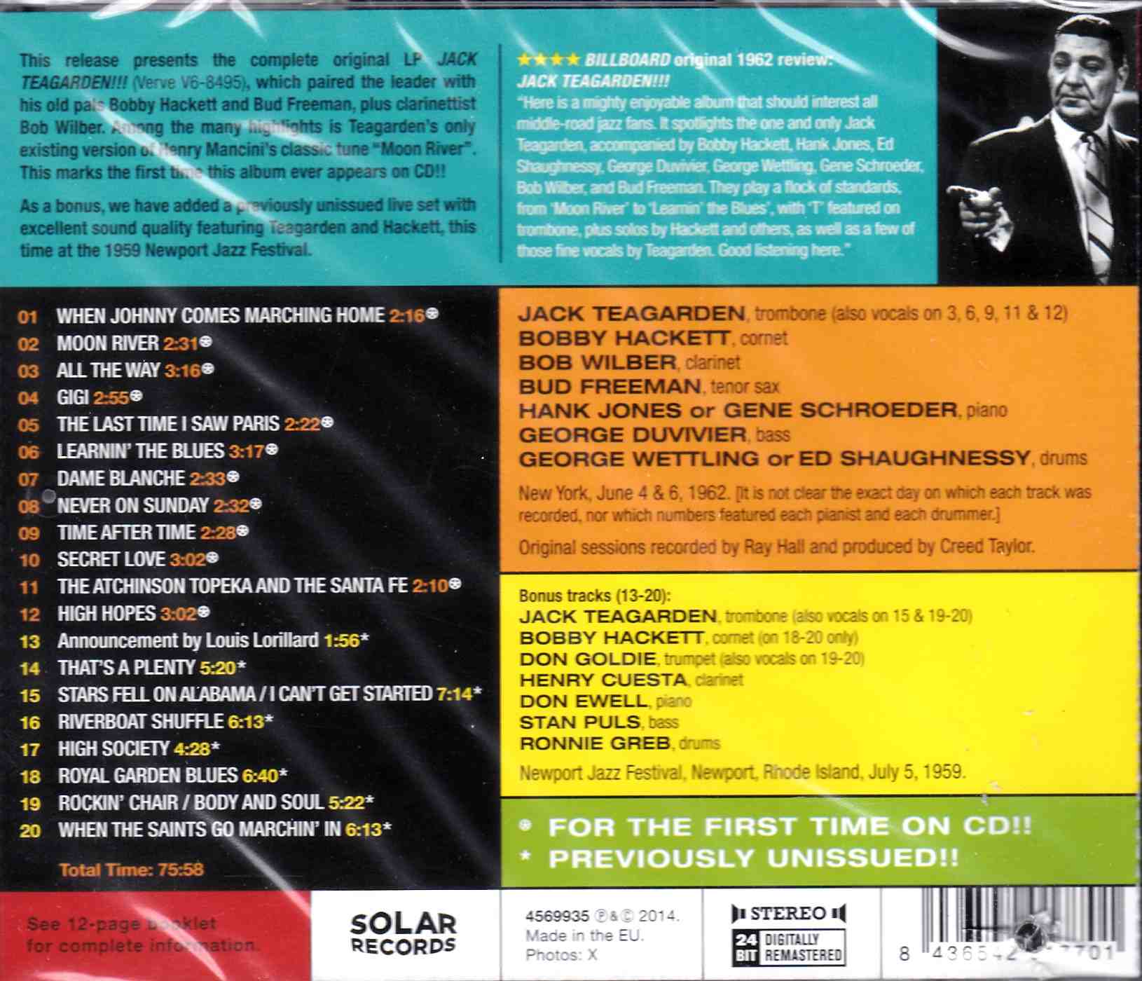 First time on CD for the self titled 1962 Jack Teagarden LP, released on Verve which paired the leader with his old pals Bobby Hackett (cornet) and Bud Freeman (tenor sax) plus clarinettist Bob Wilber. Among the many highlights is Teagarden’s only existing version of the classic Mancini tune “Moon River”.