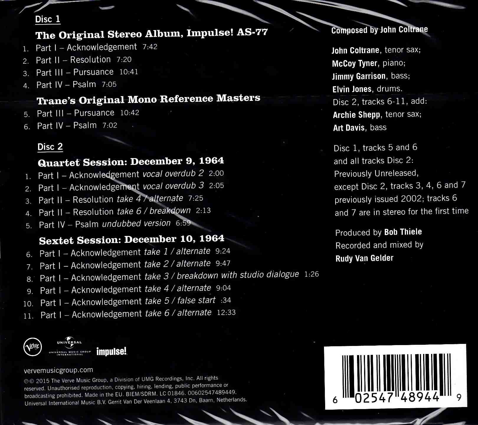 This edition finally collects all the previously unavailable outtakes, overdubs, and studio chatter from the sessions of the 9th & 10th December 1964, including additional takes involving saxophonist Archie Shepp and bassist Art Davis. Only two of these takes have been released previously and here they figure alongside two previously unreleased mono reference tracks from Coltrane’s own collection and seven additional unreleased takes from both sessions, including all six takes of ‘Acknowledgment’. Also includes extensive booklet notes by acclaimed jazz writer Ashley Kahn.