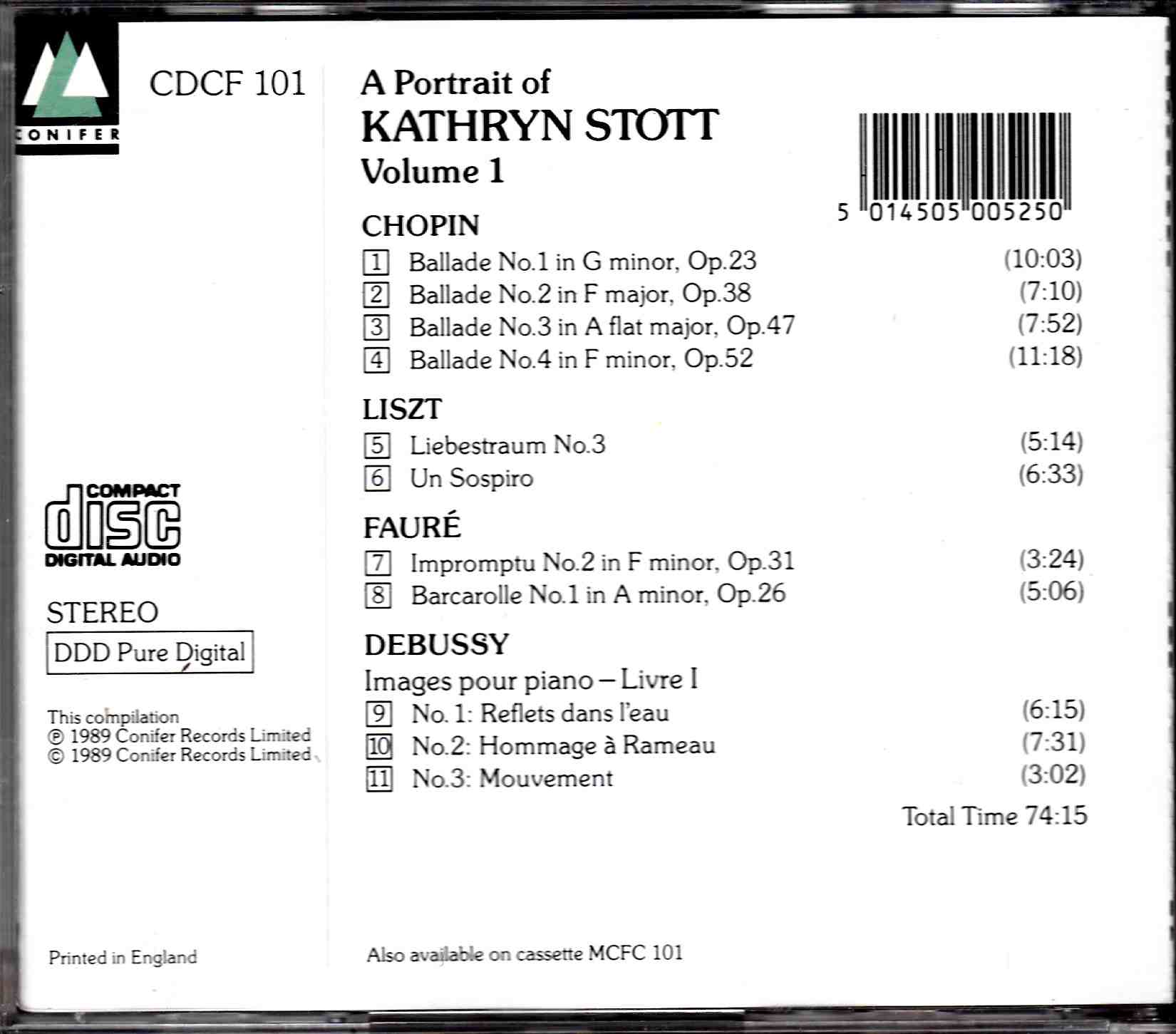 1989 compilation featuring works by Chopin, Liszt, Faure & Debussy. CD has some light scratches, minor handling to booklet.