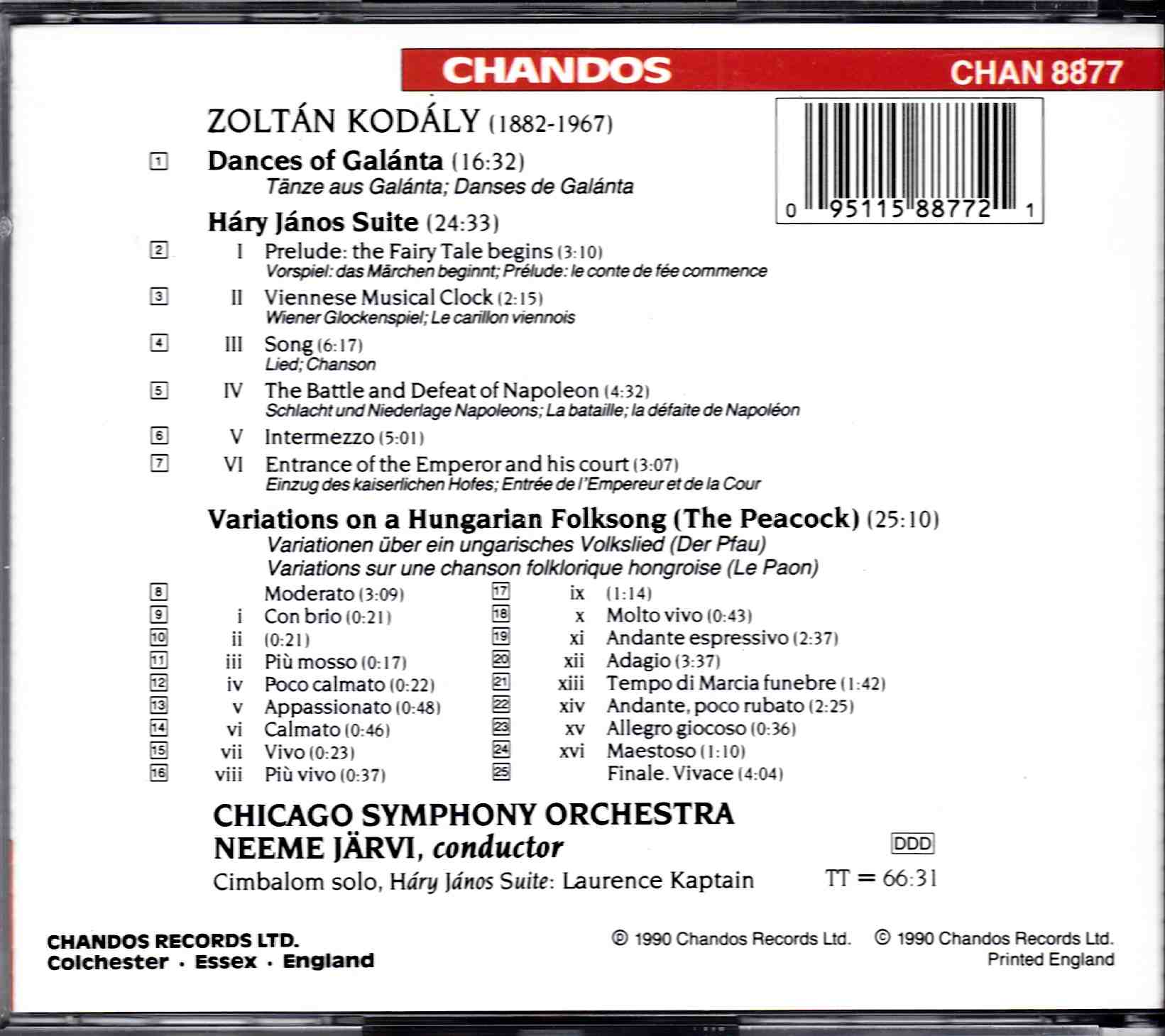 Kodaly: Hary Janos Suite; Peacock Variations; Dances of Galanta – Chicago SO, Jarvi | CD, Chandos
