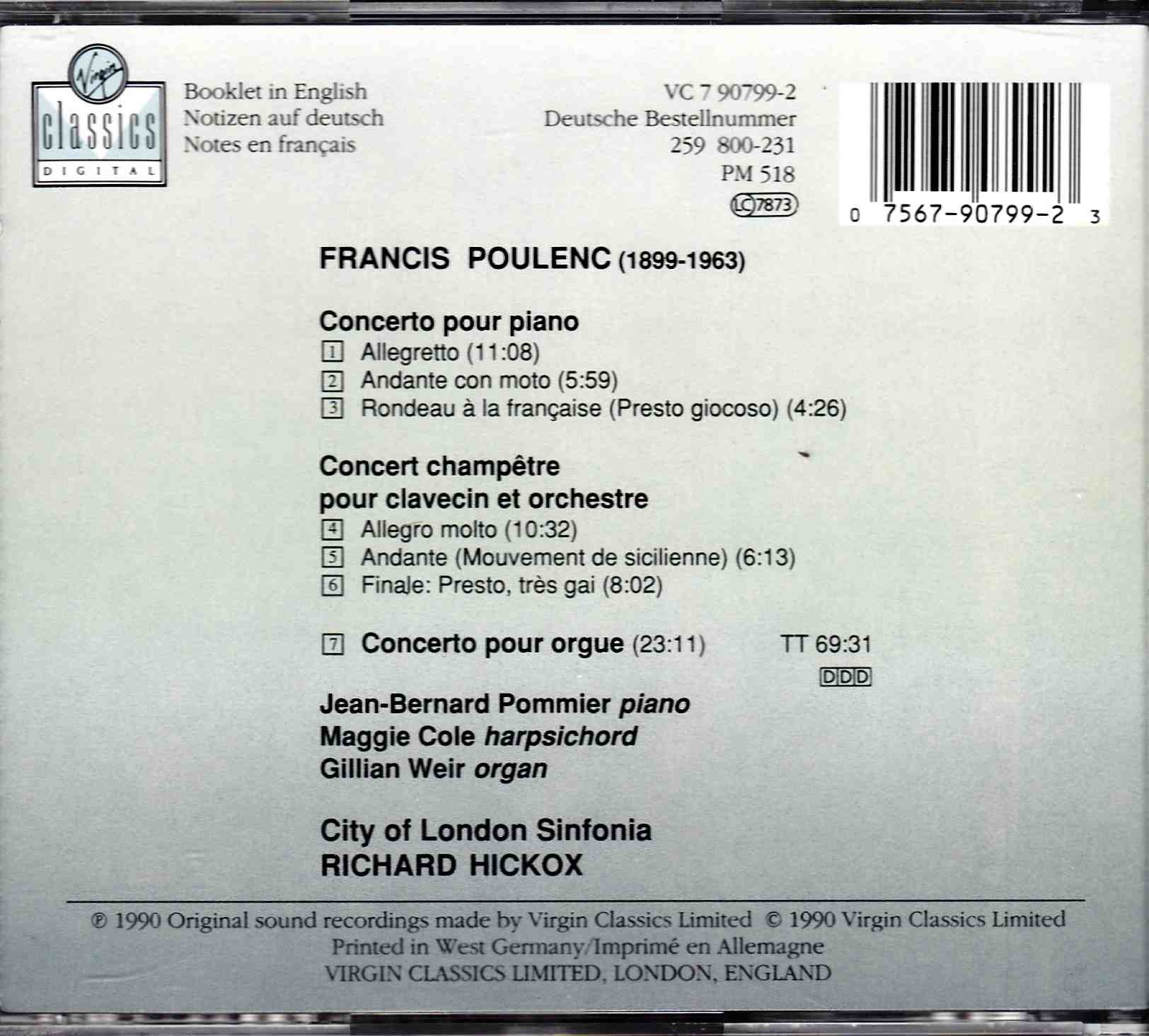 Poulenc: Concertos for Solo Keyboard – Cole, Weir & Pommier, City of London Sinfonia, Hickox | CD, Virgin Classics