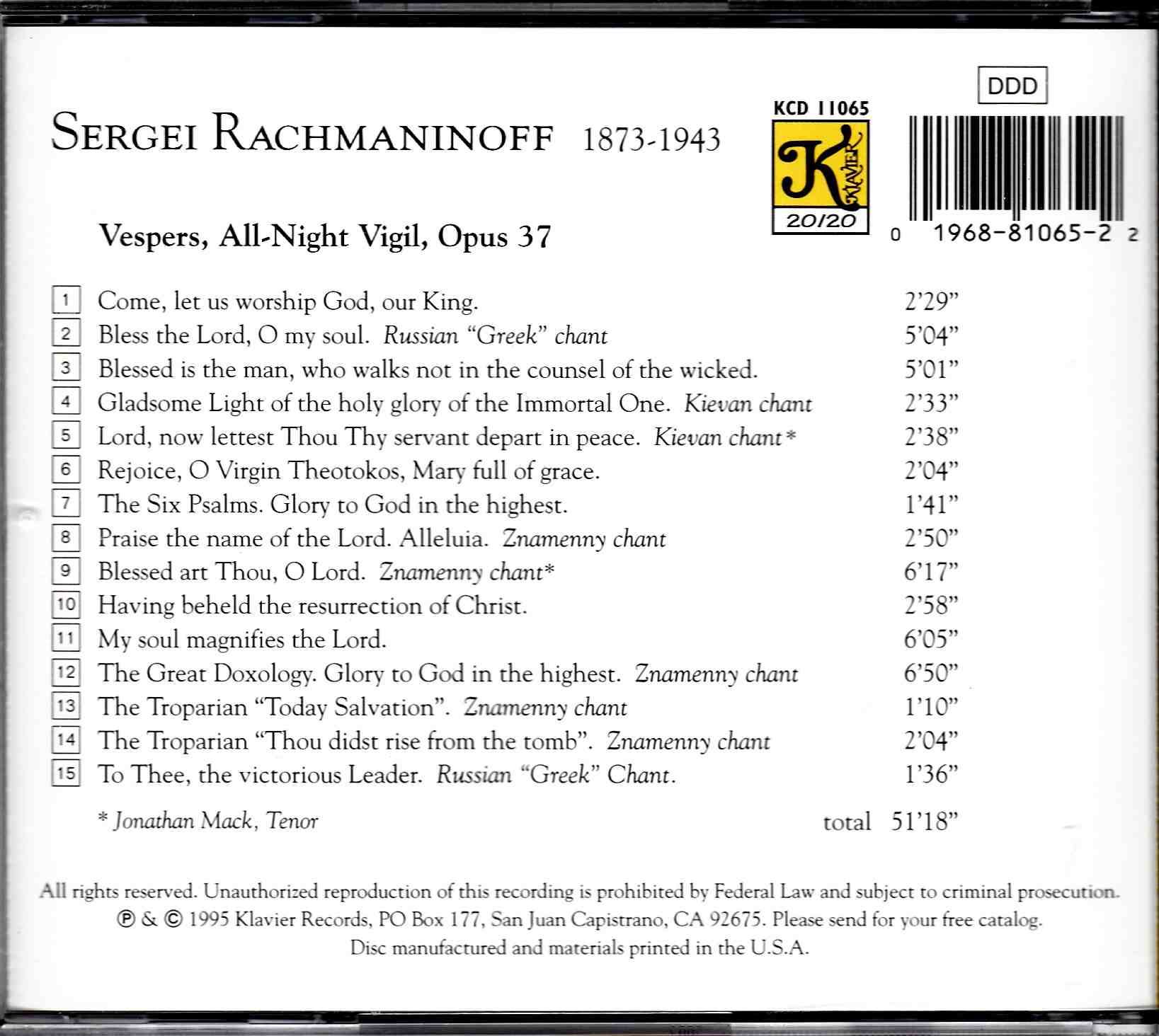 Rachmaninov: Vespers, All Night Vigil, Op.37 – William Hall Master Chorale | CD, Klavier