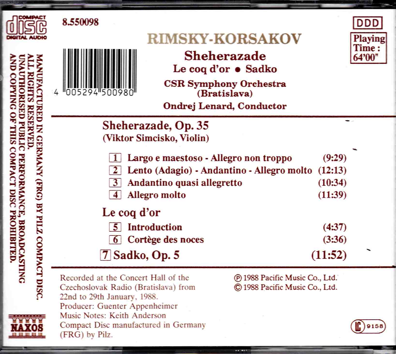 Rimsky-Korsakov: Sheherazade. Op.35; Le coq d’or; Sadko Op.5 – CSR SO (Bratislava), Lenard | CD, Naxos