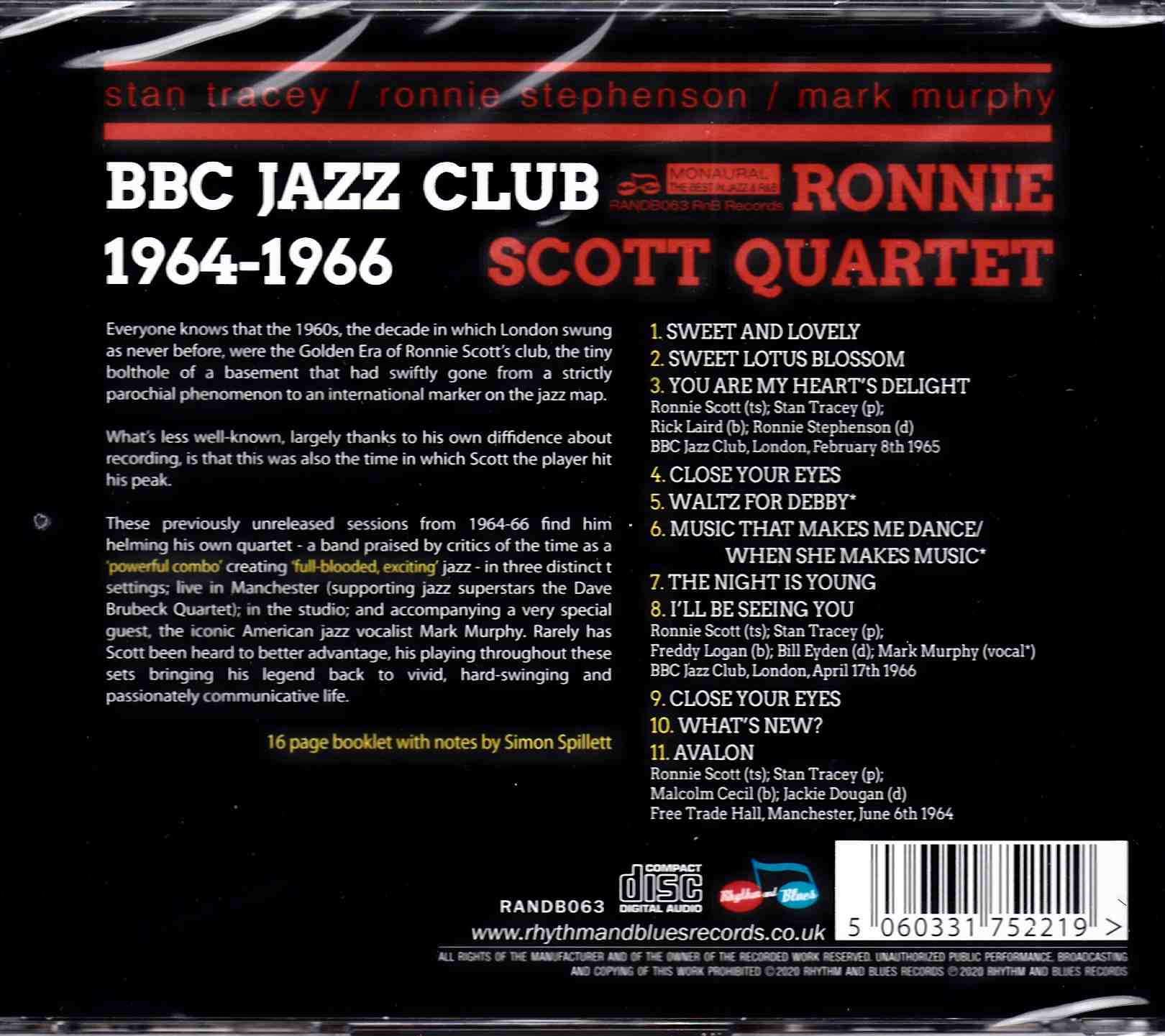 These previously unreleased sessions from 1964-66 find him helming his own quartet – a band praised by critics of the time as a ‘powerful combo’ creating ‘full-blooded, exciting’ jazz – in three distinct t settings; live in Manchester (supporting jazz superstars the Dave Brubeck Quartet); in the studio; and accompanying a very special guest, the iconic American jazz vocalist Mark Murphy. Rarely has Scott been heard to better advantage, his playing throughout these sets bringing his legend back to vivid, hard-swinging and passionately communicative life.