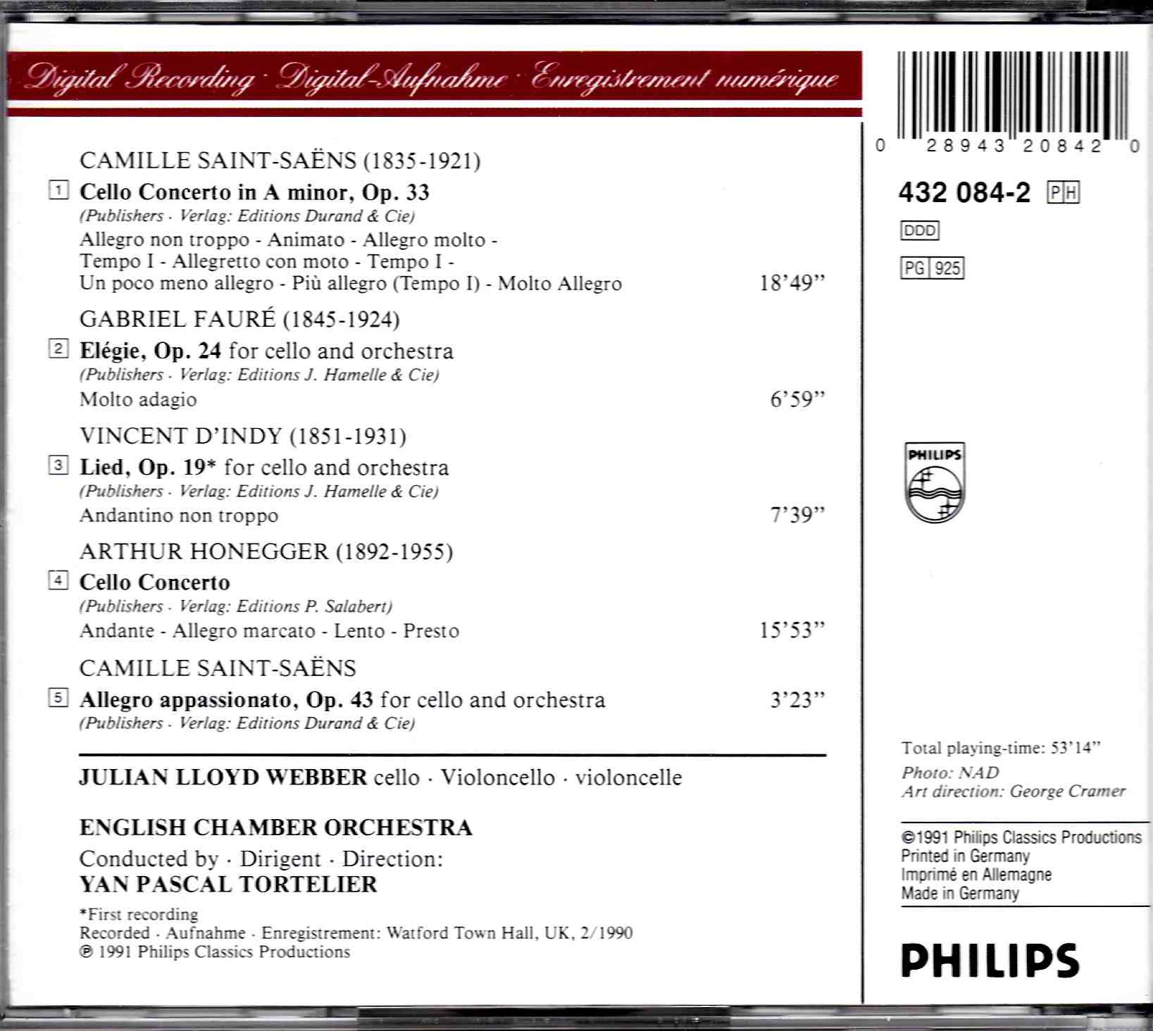Saint-Saens & Honegger: Cello Concertos – Julian Lloyd Webber, English CO, Tortelier | CD, Philips