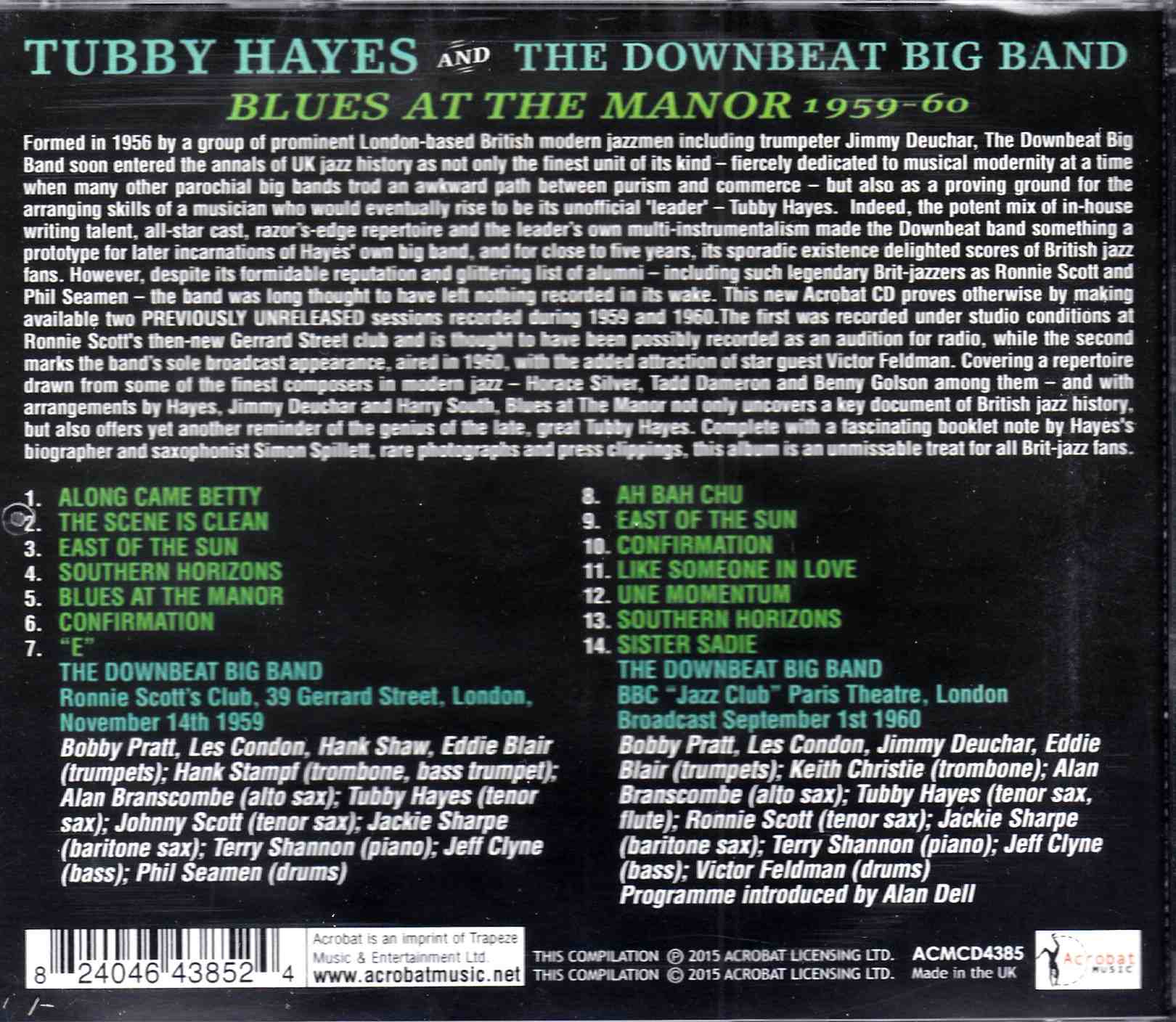 Two previously unreleased sessions from 1959/60 – a key document of British jazz history. The Downbeat Big Band, headed by Tubby Hayes, with among its personnel a host of top British modern jazz stars such as Ronnie Scott, Jimmy Deuchar and Phil Seamen, was the finest unit of its kind but thought to have left no recordings in its wake so this release marks a significant discovery. The first session was recorded under studio conditions at Ronnie Scott’s club and the second was the band’s sole broadcast appearance (Victor Feldman guests).