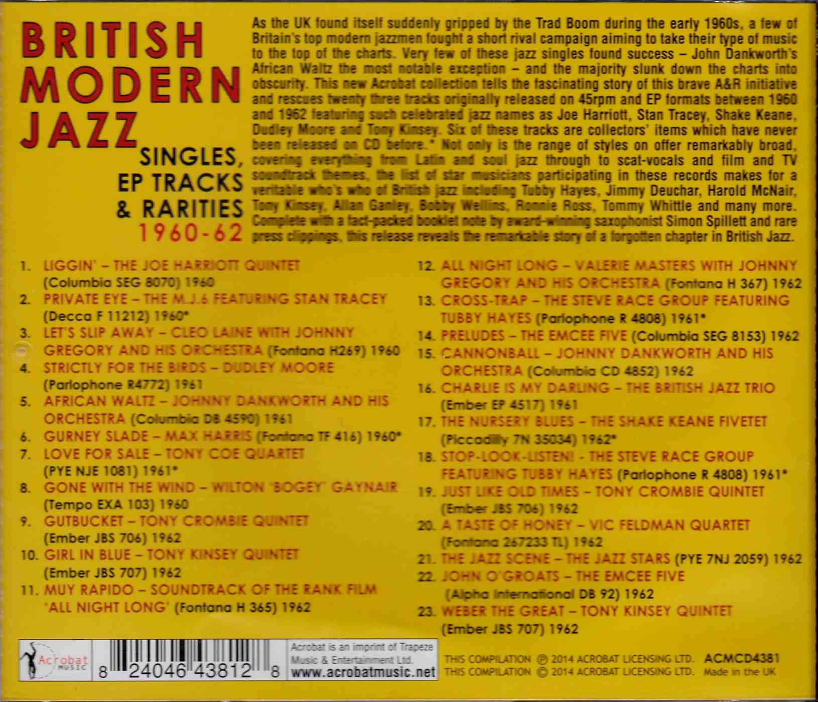 This Acrobat collection tells the fascinating story of this brave A&R initiative and rescues twenty tracks originally released on 45rpm and EP formats between 1960 and 1962 featuring such celebrated jazz names as Joe Harriott, Stan Tracey, Shake Keane, Dudley Moore and Tony Kinsey. Six of these tracks are collectors’ items which have never been released on CD before.