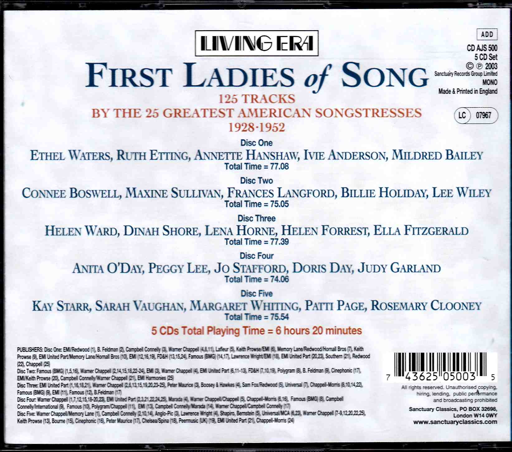 Lovely 5-CD set of some great singers. Disc one has some light scratches, the others immaculate. Booklet in good shape.