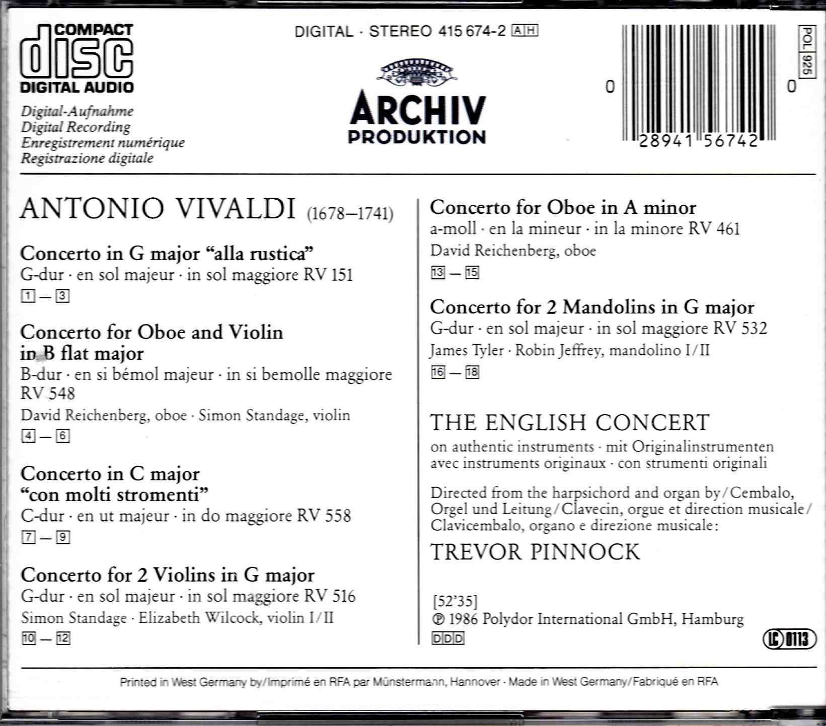 Vivaldi: Concerti “Alla Rustica” – Standage, Willcock, Reichenberg, The English Concert, Pinnock | CD, Archiv Produktion