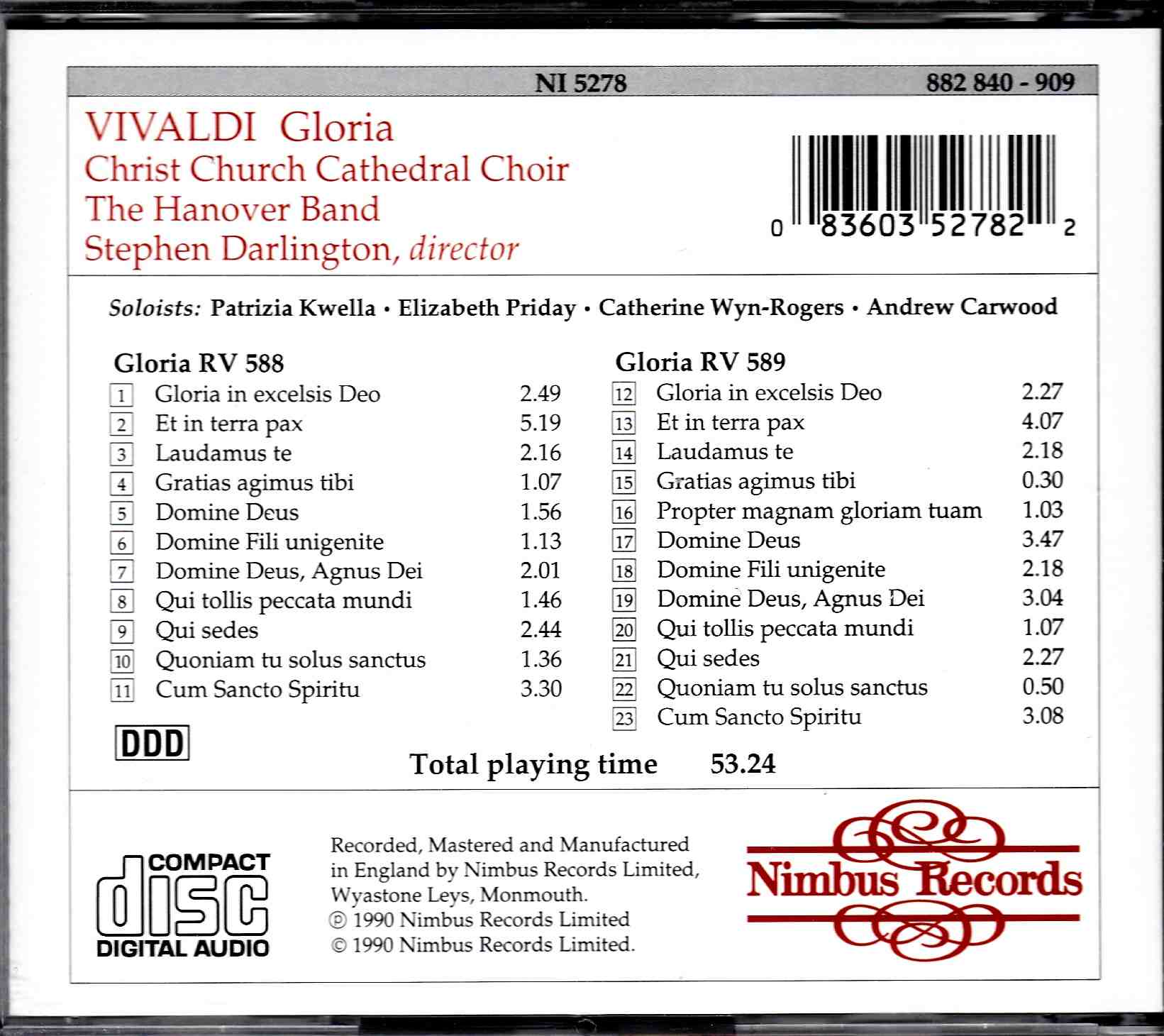 Vivaldi: Glorias RV 588 & RV 589 – Kwella, Wyn-Rogers, Christ Church Catherdral Choir, Hanover Band, Darlington | CD, Nimbus